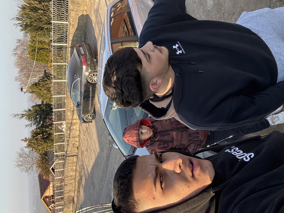 This image depicts three males standing outdoors in a residential area of Oryahovo, Bulgaria, under bright sunlight