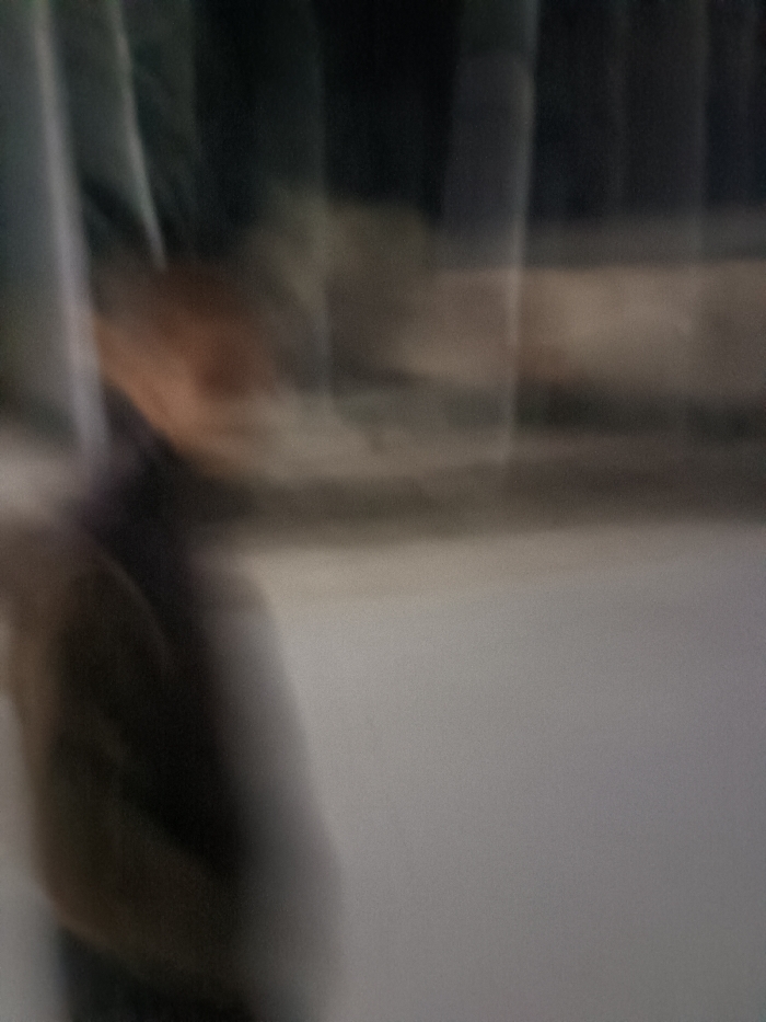 An obscured figure stands silhouetted against a blurred background. The scene is predominantly grey and indistinct, featuring vague shapes suggestive of a human form on the left and what appear to be vertical lines possibly indicating a window. The overall impression is one of motion and uncertainty, making it difficult to discern details.