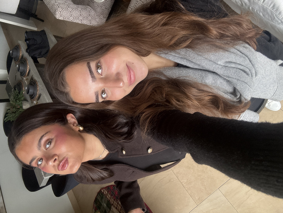 Two young women pose closely for a selfie. The woman on top has long, wavy brown hair and wears a grey sweater. She gazes at the camera with a slight smile. The woman below has dark brown hair styled behind her ears and wears a brown jacket with gold buttons over a black top. Her makeup includes prominent blush. The background shows a tiled floor and a glimpse of a decorative speaker.
