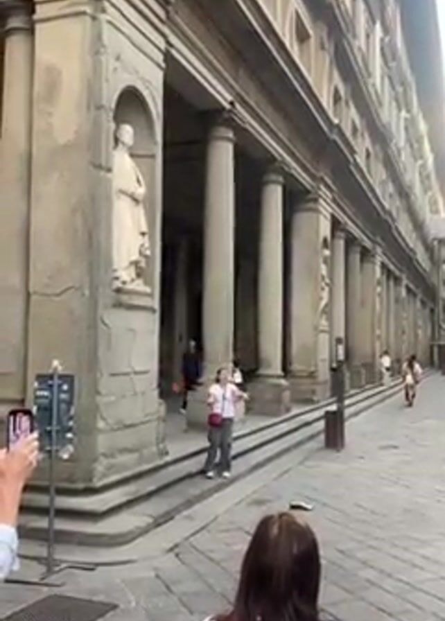 A woman standing on the steps of a building with columns raises her arms and smiles. A person in the foreground takes a picture. The building is tall and gray, with a statue on the left side. The street is paved with stone. Other people walk in the background.