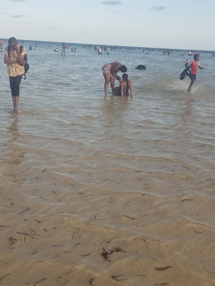 - "The image depicts a crowded beach scene in Shanzu ward, Kenya, with numerous individuals wading and playing in shallow, clear ocean water under a light blue sky with minimal cloud cover" by FM-vsiag2, licensed under CC BY 4.0
