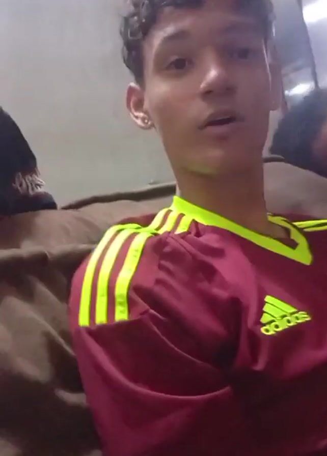 three young men in what appears to be a casual indoor setting, possibly a living room. One man is reclining on a couch wearing a red and black polo shirt. Another man wearing a maroon Adidas soccer jersey with yellow trim is seated beside him. A third man is standing and looking at his phone. The man on the couch is gesturing with his hands and talking. The person holding the phone filming is also talking. The lighting is bright. The room appears to be cluttered, and there are decorations on the walls.