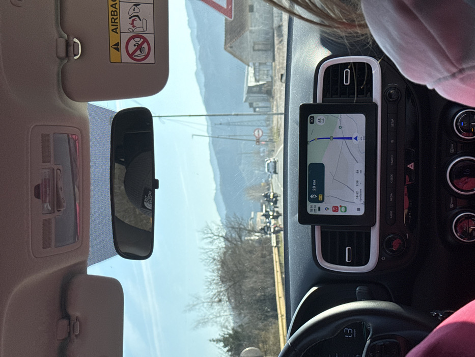 The image captures a first-person view from the interior of a vehicle proceeding along a paved road in Nikšić, Montenegro, under a clear, bright sky