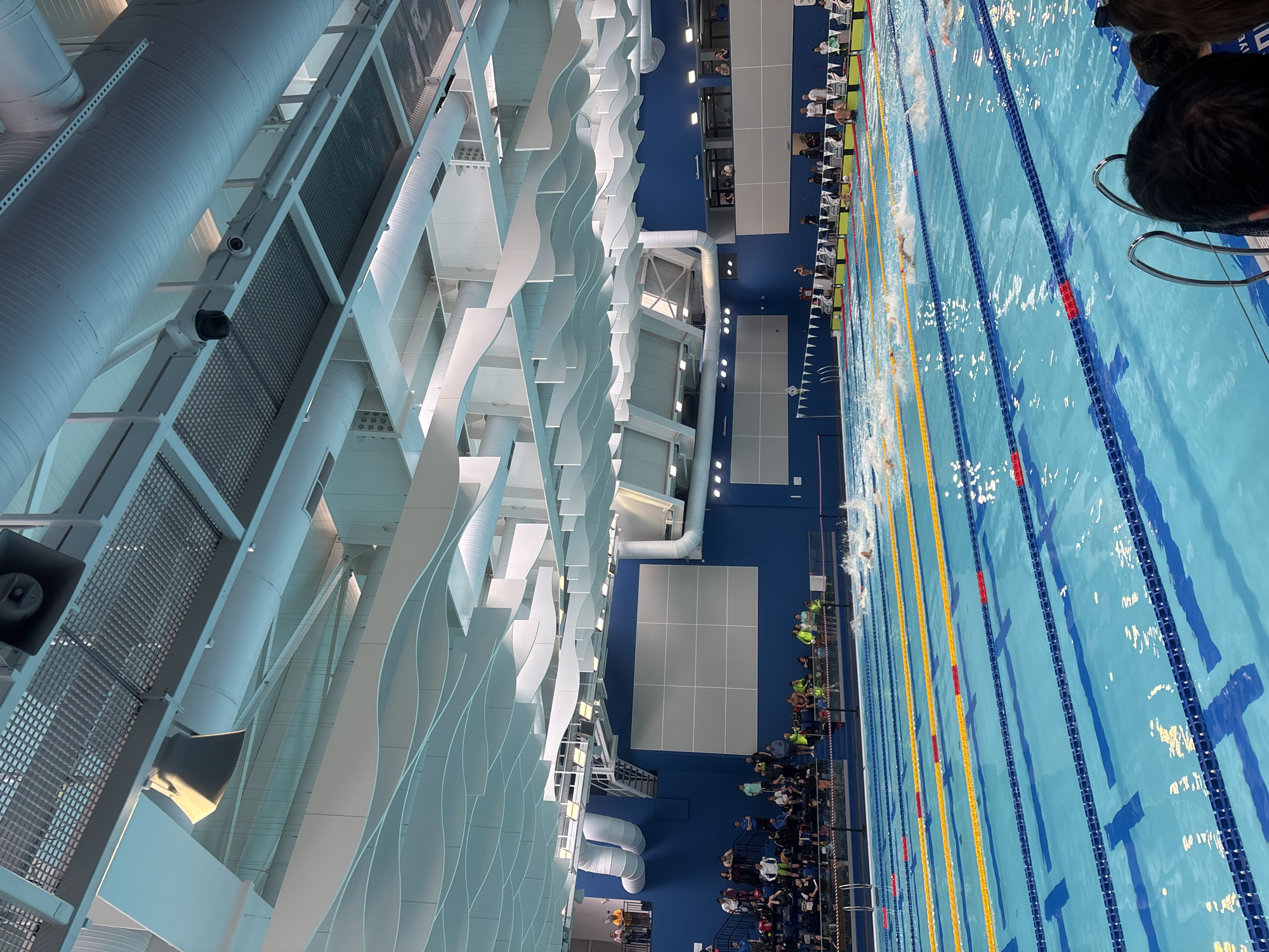 inside of a swimming pool complex. An indoor swimming pool with several lanes is visible. Swimmers are participating in a race. On either side of the pool are spectators. Above the pool is an elaborate system of HVAC vents and structural supports. Based on the indoor setting and type of event, it’s possible that this is the "Park "Lauta" swimming complex in Plovdiv, Bulgaria.