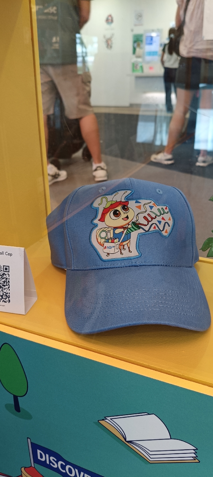 A light blue baseball cap with a cartoon character on the front is on display. The cartoon character appears to be an insect with a hat and backpack, holding a colorful banner. A white sign with a QR code is next to the cap. The cap sits on a yellow shelf. Beneath the shelf, there's a blue background with cartoon drawings of a tree, a book, and a flag labeled "DISCOVER." Through the window, one can see people walking by.