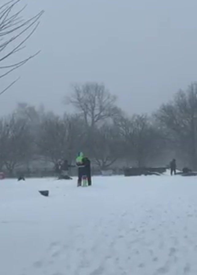snowy park on a day with heavy snowfall. Several people are visible in the park; two of them are standing close together near the center of the frame, one wearing a bright green vest and the other a darker coat. Other figures are seen in the background at varying distances, walking or standing. The ground is covered in a thick layer of snow with footprints visible. Bare trees are scattered throughout the landscape. The camera is handheld and moves slightly, eventually revealing a person wearing a black coat and a cowboy hat standing in the foreground.