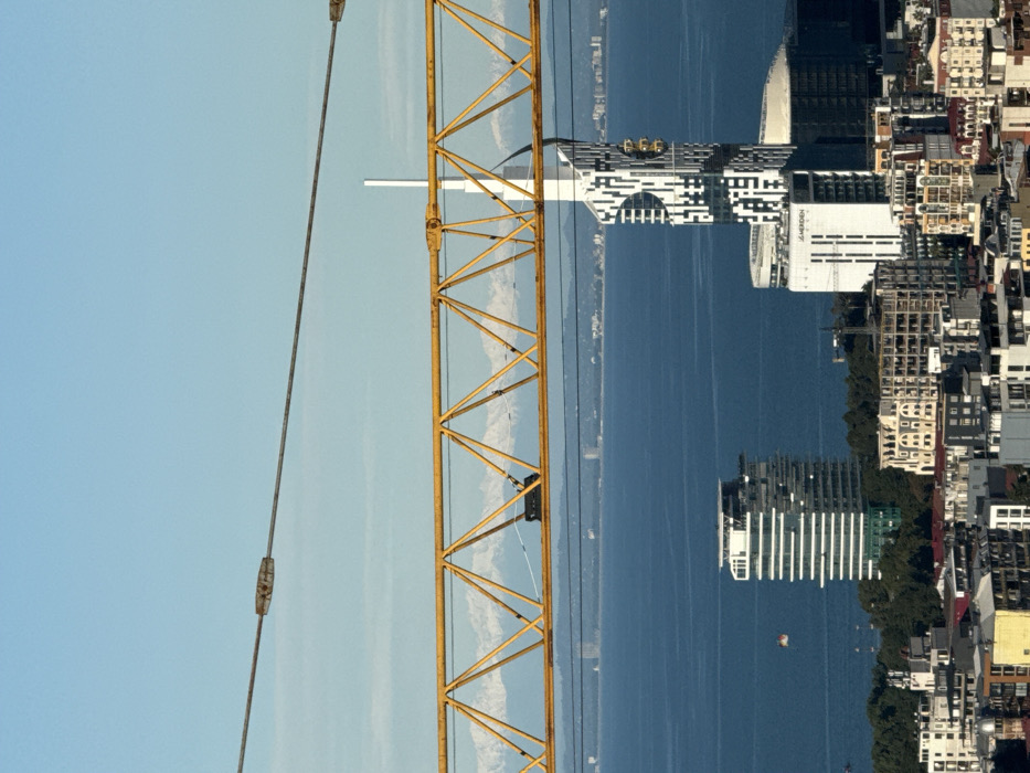 This elevated image depicts a coastal urban landscape in Batumi, Georgia, viewed under a clear blue sky. The upper portion of the frame is bisected horizontally by the robust yellow lattice boom of a construction crane, above which a thick grey metal cable diagonally traverses the scene. Below the crane, the expansive, calm dark blue waters of the Black Sea are visible. A small, reddish-orange object, possibly a buoy or boat, floats on the water in the mid-left. A faint, distant coastline with scattered structures is discernible across the sea, backed by a prominent horizontal range of snow-capped mountains. The city of Batumi occupies the lower half of the image. The distinctive Batumi Tower, a tall, white, and black building featuring an integrated Ferris wheel on its side, is prominent on the right. Directly below it, a white building displays "LE MERIDIEN" text. To the left of these, another modern, multi-story building with a white facade and horizontal windows is visible. The immediate foreground consists of a dense network of diverse urban structures, including multi-story residential and commercial buildings, with several showing exposed concrete construction frameworks. No human figures or specific actions are discernible within the frame.