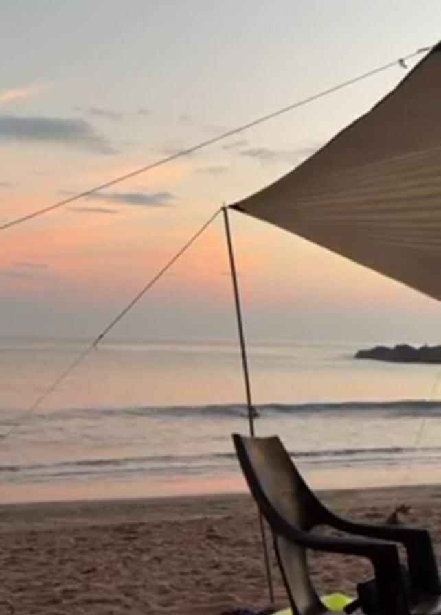 The video depicts a beach scene at dusk, with a pastel pink and orange sky visible in the background. In the foreground, a black plastic chair sits on the sand under the shade of a tan-colored canopy supported by thin poles and ropes. The ocean is calm with small waves gently washing ashore. Two individuals are seen entering the water and walking along the shoreline in the distance. The beach appears sandy, and the overall scene suggests a serene and quiet setting.