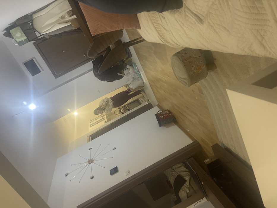 A dimly lit, rotated interior view shows a bedroom and adjacent kitchen