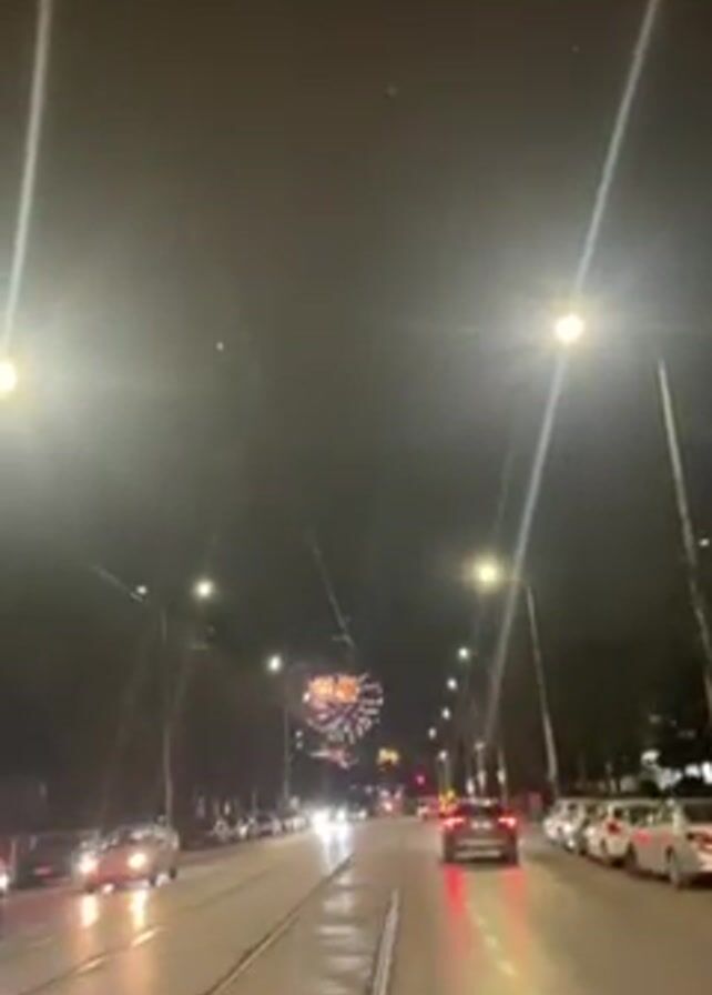 The scene takes place at night on a city street. Cars move down the road, their headlights and taillights illuminated in the darkness. Streetlights line the road, casting a bright glow. Fireworks explode in the sky, creating bursts of light and color. The road appears wet, and there are parked cars along the side. The camera angle suggests that the footage was taken from a vehicle, possibly a tram or car, moving along the road. The sky is dark, providing a stark backdrop for the colorful fireworks.