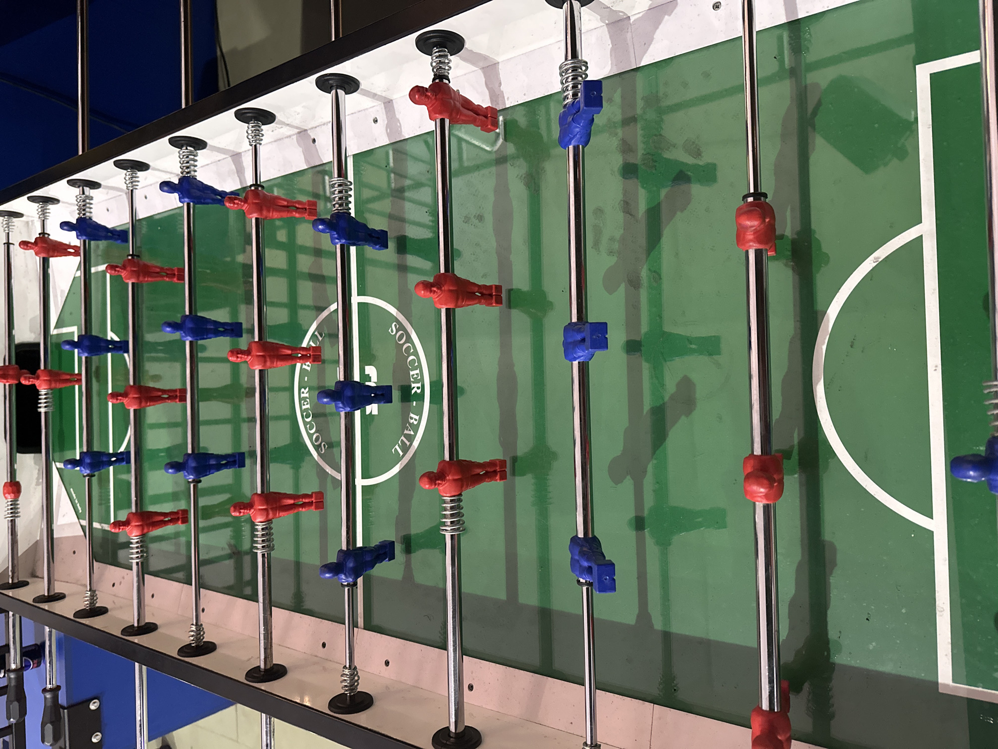 close-up, angled view of a foosball table. The table features red and blue players affixed to chrome rods that extend across the playing surface. The rods are spaced evenly, and some have springs at the top. The playing field is green, with white lines marking the boundaries and center circle of a soccer field, along with "SOCCER - BALL" written on the center circle. The table's side is visible, showing a blue and white color scheme. The location is not discernible from the image itself. There are no people present.