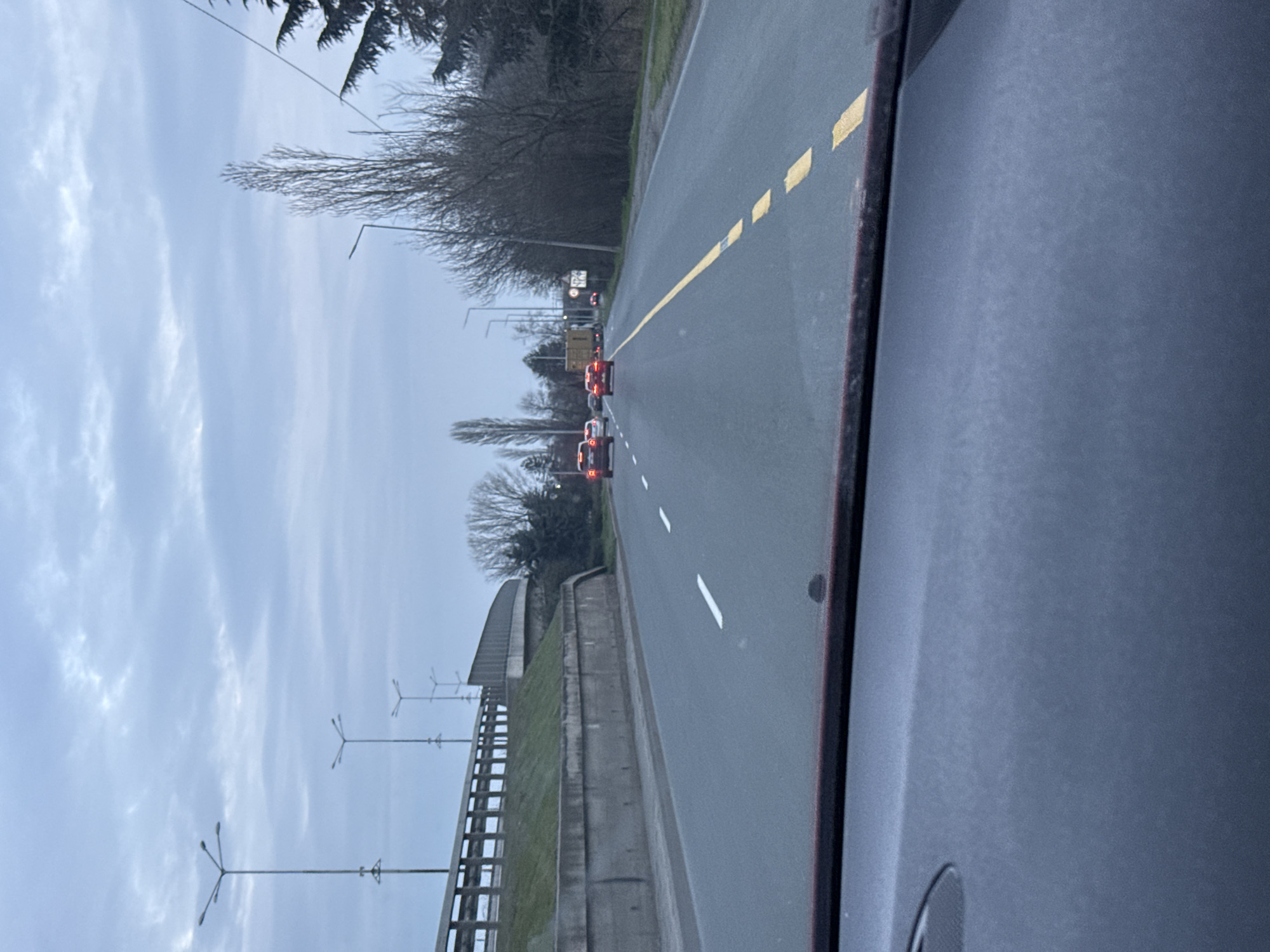 A view from inside a car on a road with a dashed yellow line marking the lanes. Multiple vehicles are visible further down the road with their brake lights on. The road is bordered by a concrete barrier with a fence on top and lampposts. Bare trees are visible in the background under a cloudy sky. It is not possible to confidently determine the location of Burgas, Bulgaria from the provided image.