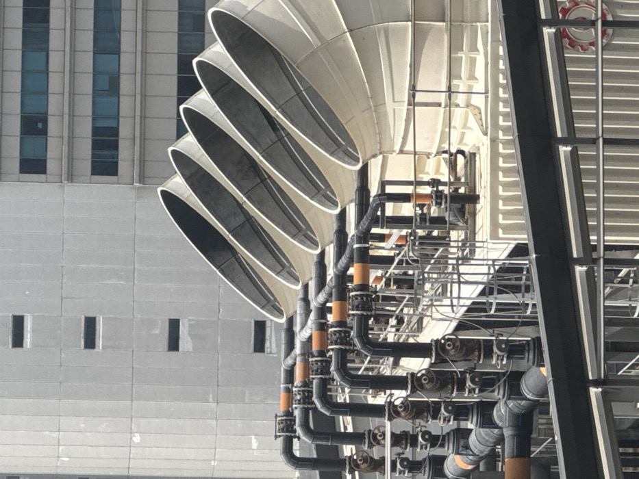 A close-up captures industrial infrastructure, featuring a series of large, white, funnel-shaped structures arranged in an arc. These are connected by a complex network of black pipes with orange sections, possibly for ventilation or cooling. The pipes have valves. A tall building with vertical windows stands in the background to the left. Right shows a structure with a red cogwheel.