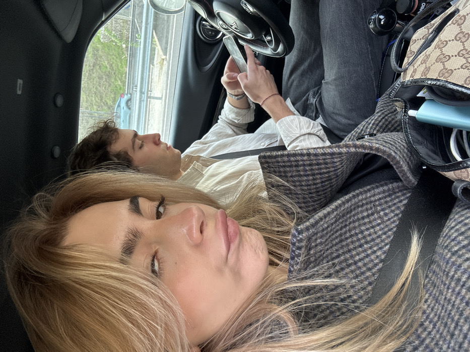 An image taken from the front passenger seat of a vehicle in Loures, Portugal, depicts two individuals inside the car