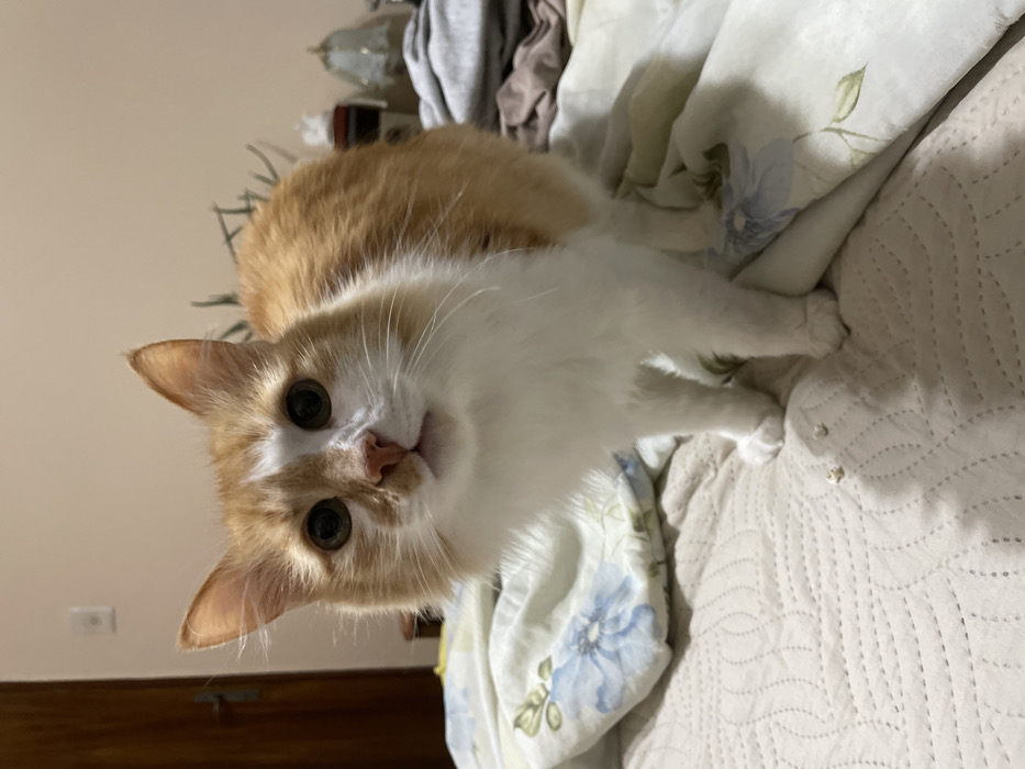 - "A domestic cat, predominantly white with orange and ginger markings, stands on a bed" by FM-orEo22, licensed under CC BY 4.0