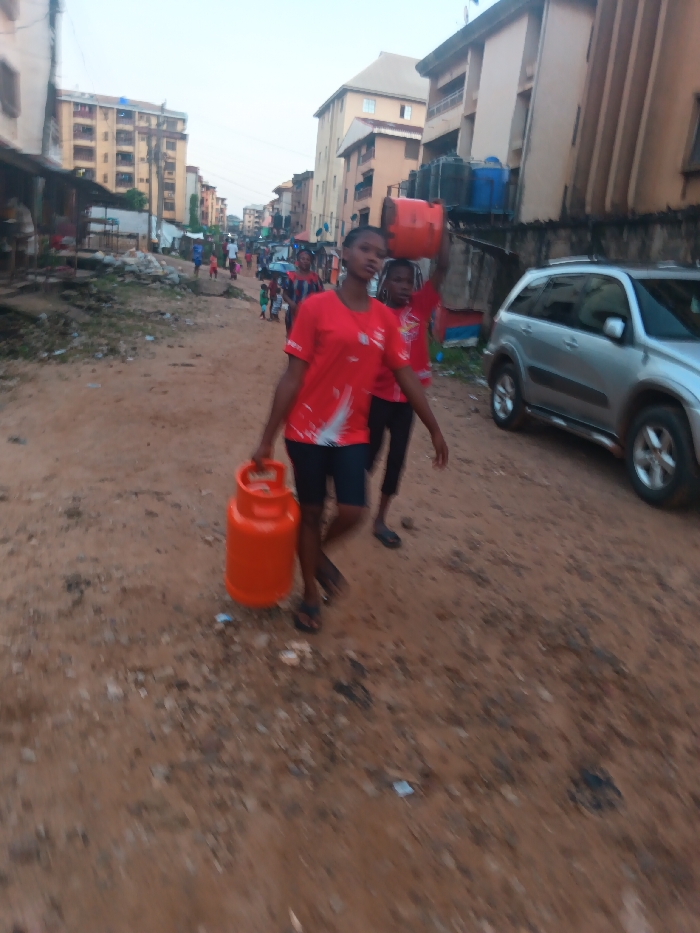 An unpaved, reddish-brown dirt street in Onitsha, Nigeria, is depicted under an overcast sky. In the foreground, two young females walk towards the viewer, their motion slightly blurred. The leading female, on the left, wears a red short-sleeved shirt with white markings, dark shorts, and dark flip-flops. She carries a bright orange liquefied petroleum gas (LPG) cylinder in her right hand. Behind her, a second female, partially obscured, also wears a red shirt and dark attire. She balances a red plastic bucket or container on her head. To the right, a silver SUV is parked facing away from the viewer. Multi-story buildings, some with balconies and visible water tanks (blue and black), line both sides of the street. Further down the street, additional individuals, including children, are visible, and makeshift structures or stalls are present on the left side of the road. Debris is scattered on the ground.