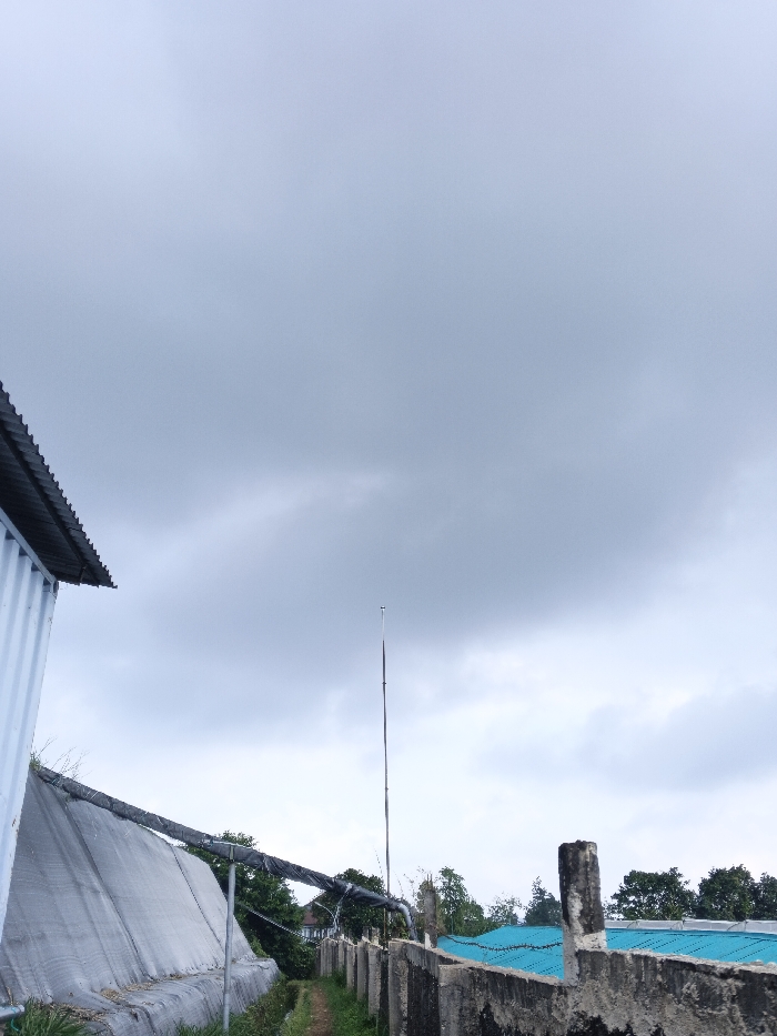 The image displays an outdoor scene in Koipa, Papua New Guinea, under a predominantly overcast sky with light grey clouds. In the left foreground, a section of a building is visible, featuring light blue corrugated metal siding and a dark corrugated roof. Extending from this building is a sloped structure covered in dark grey netting, with a dark pipe running along its upper edge. A narrow, unpaved dirt path leads into the background, separating the netted structure from a weathered concrete wall on the right. This concrete wall exhibits discoloration and features several irregular concrete posts along its top. Behind the concrete wall, a structure covered with a bright blue tarpaulin is discernible. A tall, slender pole, appearing to be made of wood or bamboo, stands vertically in the center-left, topped with a small white tip. Green trees and various vegetation are present in the background and along the path. No individuals or discernible actions are depicted.