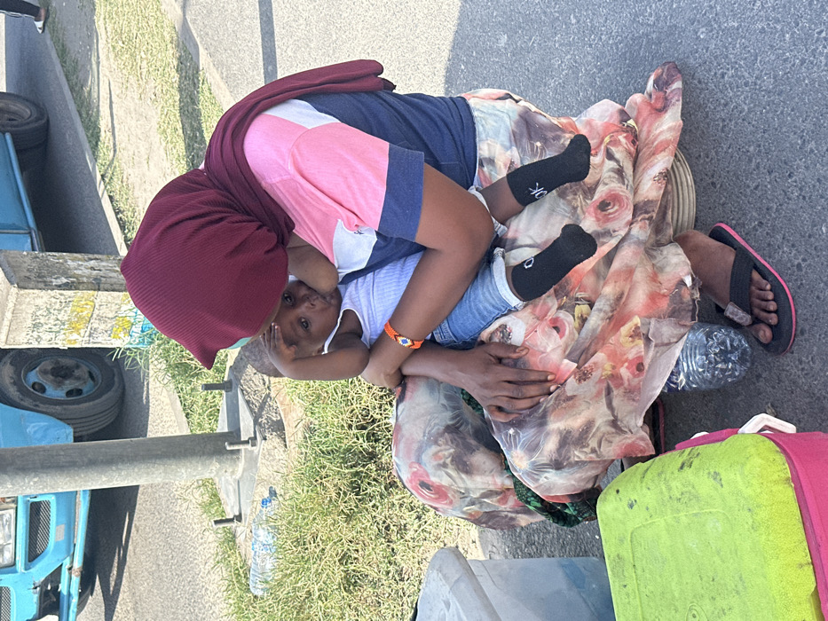 The image depicts an adult female holding a young child in an urban street setting in Dar es-Salaam, Tanzania. The female is seated on the ground, wearing a dark red head covering, a color-block shirt (pink, white, and dark blue sections), and a long, floral-patterned skirt in shades of peach, red, and green. Her visible foot wears a black flip-flop with a pink sole. The child, an infant or toddler, is dressed in a white ribbed tank top, light blue denim shorts, and black socks marked with "OK" text. An orange beaded bracelet is visible on the child's right wrist. The female cradles the child with her right arm; the child's head is positioned near her chest, and its right hand is raised towards its temple. In the lower left foreground, a green cooler with a yellow lid and a pink plastic container are partially visible. A clear plastic water bottle lies on its side on the ground near the female's leg. The background features a grey metal utility pole, a partially visible light blue vehicle (likely a bus or truck), and a weathered concrete block. The ground consists of asphalt and patches of dry grass, illuminated by bright daylight.