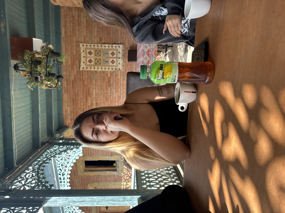 The image depicts two individuals seated at a wooden table on a shaded outdoor patio or veranda in Kvakhvreli, Georgia. The primary subject, a fair-skinned female with long blonde hair and dark eyebrows, sits on the left, looking directly forward. She wears a black spaghetti strap top. Her right hand holds a dark object, possibly a vape pen, near her chin. Her left arm rests on the table, revealing a tattoo on her inner bicep area that reads "LOOK MOM, I CAN FLY." above a winged design. A white Kimbo espresso cup with dark liquid is positioned in front of her. To her right, a second female subject is partially visible, showing long brown hair and a grey hooded jacket. Her hands are clasped on the table, and a white cup is partially visible near her. Centrally on the table, a plastic bottle of Fuse Tea (Mango flavor) with a green cap stands next to a partially visible black smartphone. Strong sunlight casts dappled shadows on the wooden table surface. The background features a blue-painted wooden ceiling structure with an ornate dark chandelier adorned with artificial plants. A red-brick wall is visible behind the subjects, decorated with a patterned textile wall hanging. To the far left, an intricately carved blue wooden railing or balustrade is visible, with a stone structure featuring a window opening behind it.