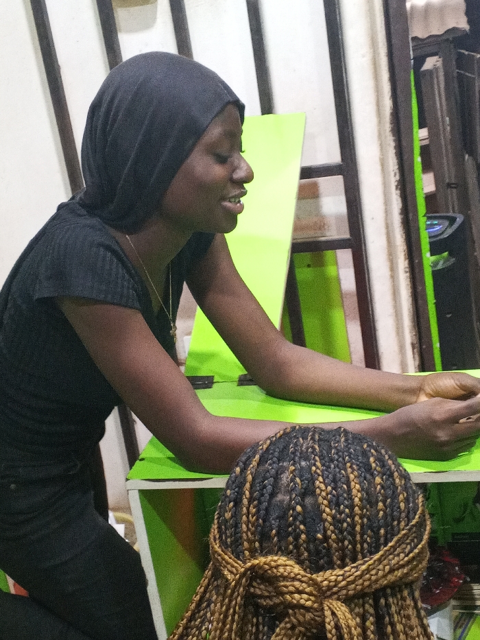 An indoor scene in Lokoja, Nigeria, features two individuals. In the foreground, the back of a person's head is visible, characterized by tightly styled dark and gold-blonde box braids, which are gathered or banded by a horizontal braid across the occipital region. In the midground, a young adult female with dark skin is depicted in profile, facing right, with a discernible smile and slightly open mouth. She is wearing a black head covering that conceals her hair, a short-sleeved dark ribbed top, and a thin gold-colored necklace with a small pendant. Her forearms are resting horizontally on a vibrant lime green shelf or counter surface. The background consists of vertical white and dark brown structural elements, possibly part of a shelving unit or partition, and to the far right, a dark electronic device partially visible with a blue illuminated display. The lighting suggests an interior setting with ambient illumination.