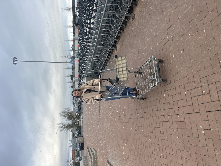 The image depicts an outdoor scene at a supermarket in Mouscron, Belgium, identified as Intermarché due to visible signage ("IT") and store layout. An adult female stands slightly left of center, facing forward with a smile. She has dark hair and wears glasses, a light beige shearling-style coat, a striped shirt, blue jeans, and brown shoes. She holds the handle of a metal shopping cart. A black object, possibly a bag or small pet carrier, is visible inside the cart's upper basket. To her right, a long, organized row of identical metal shopping carts extends into the background. The foreground and mid-ground are paved with red brick pavers laid in a herringbone pattern, on which small white specks are scattered, consistent with light precipitation. In the background to the left, a parking lot contains several parked vehicles, including a dark-colored van, and a set of grey concrete steps. A tall, multi-headed lamp post stands centrally in the mid-background. Bare deciduous trees are visible in the distant background. The sky is uniformly overcast.