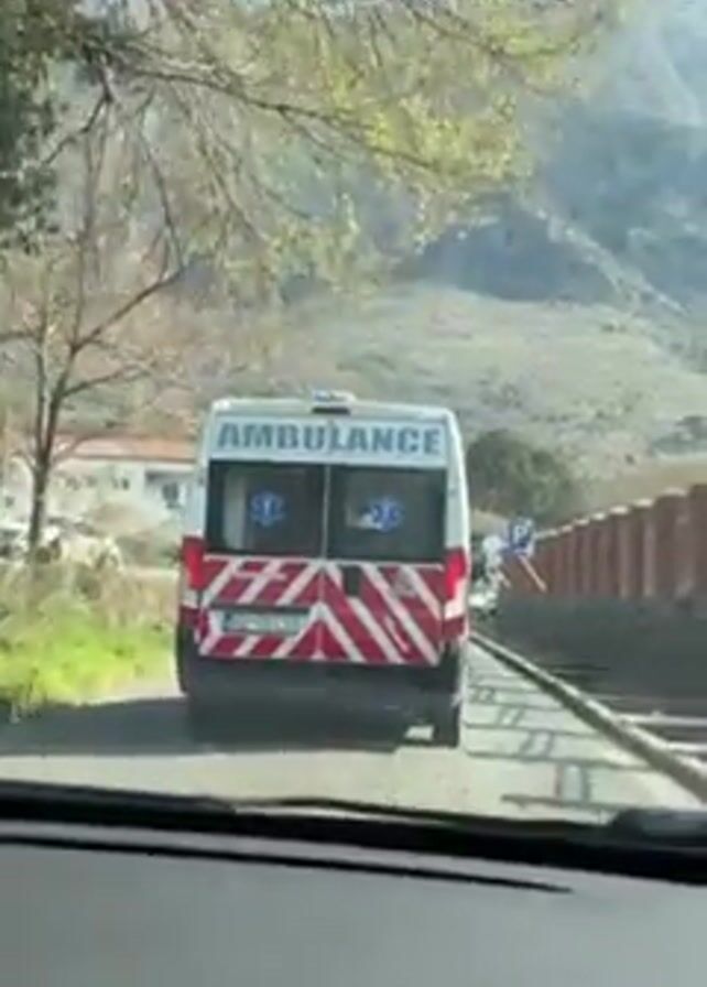 A car's dashboard camera shows an ambulance ahead on a narrow street with a mountain in the background