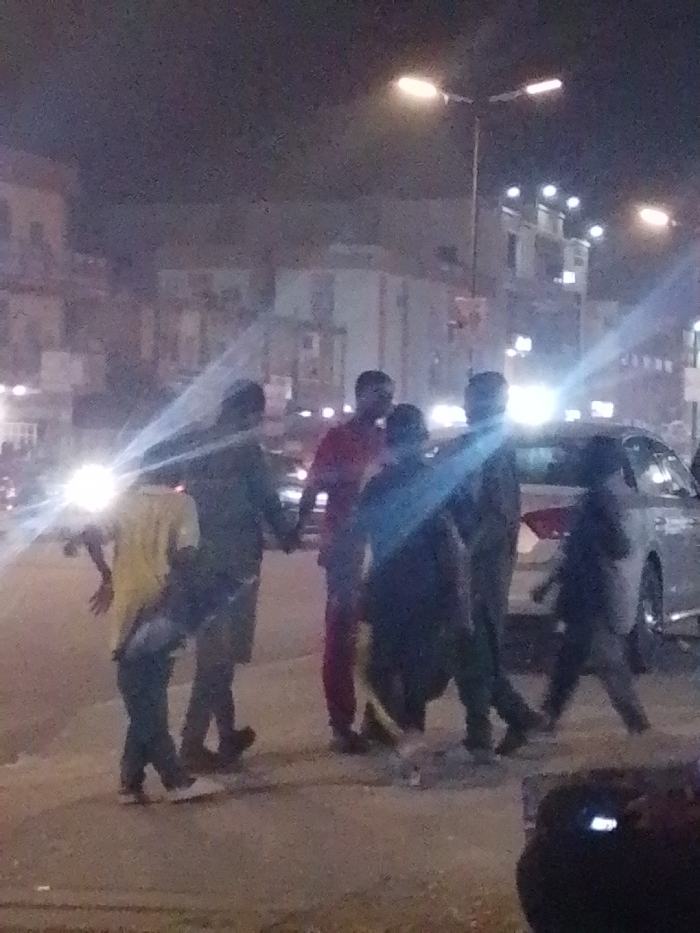 At night, a group of seven people are gathered on a sidewalk. They are standing beside a car, while buildings and street lights are visible in the background. The person in the center is wearing a red shirt and pants. One person wears a yellow shirt. The people are facing towards the left of the frame. The headlights from a vehicle are shining brightly.