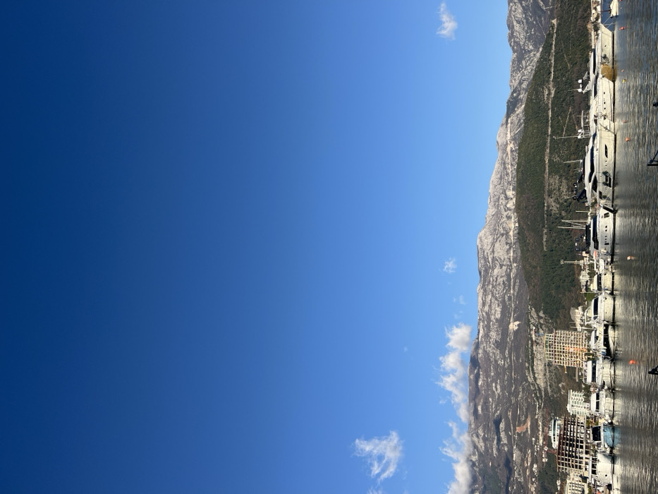 The image depicts a panoramic view of Budva, Montenegro, specifically focusing on its marina and the surrounding landscape. The upper two-thirds of the frame are dominated by a clear, deep blue sky with minimal scattered white clouds, primarily on the left. Below the sky, a prominent mountain range extends horizontally across the midground, characterized by rugged, rocky slopes interspersed with dark green vegetation. Patches of lighter-colored terrain, possibly snow or bare rock, are visible on the upper mountain slopes. In the lower third of the image, a calm, dark body of water, indicative of a harbor or bay, reflects the ambient light. A line of approximately 15 to 20 white luxury yachts and motorboats of varying sizes are docked or moored in this water, extending across the frame. Some smaller, less ornate vessels are also present. In the background, along the shoreline on the left, several multi-story buildings are visible, including modern structures with visible balconies and one building that appears to be under construction with exposed rebar. No individuals are visible, and no dynamic actions or interactions are occurring. The scene is static under natural daylight.