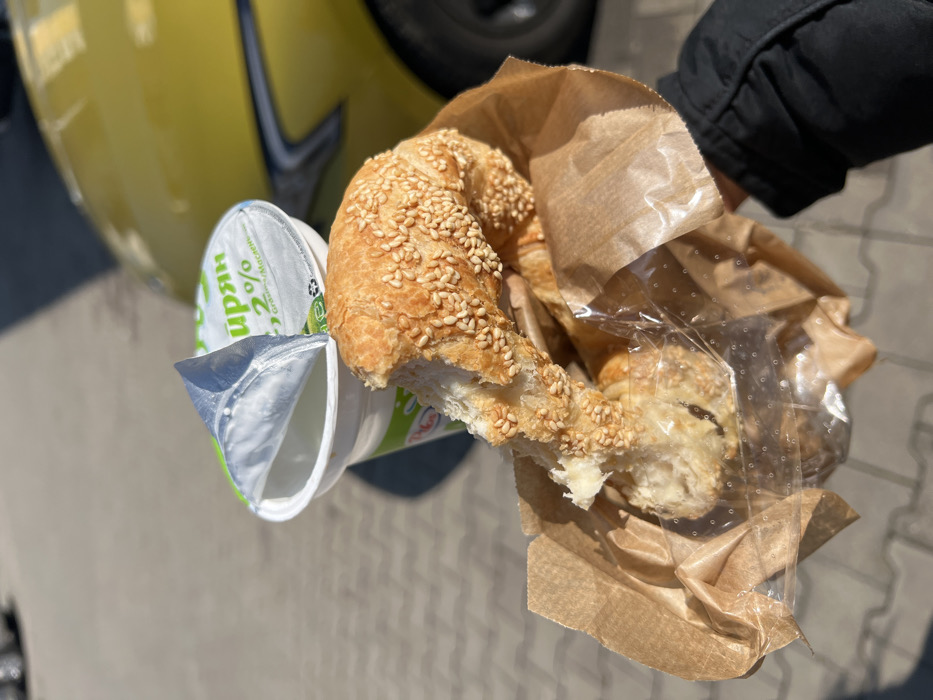 - "A person's right hand, clad in a dark sleeve, holds a light brown paper bag containing a partially consumed sesame-seed pastry and an open white plastic cup of Pilos Ayran (2% fat)" by FM-uLfUs2, licensed under CC BY 4.0