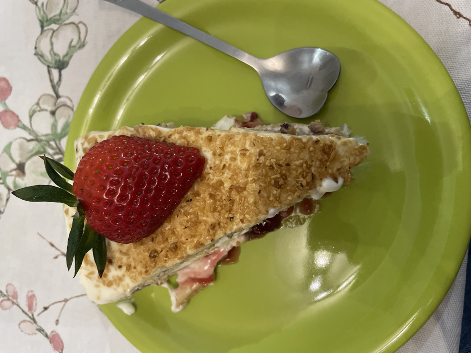 - "A close-up, high-angle shot taken in Izgrev, Bulgaria, displays a single slice of a layered dessert on a glossy, circular lime-green plate" by FM-wWAnj2, licensed under CC BY 4.0