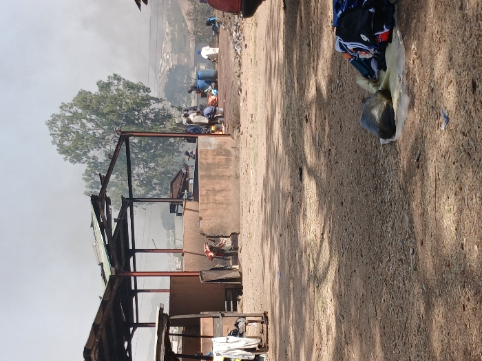 This image depicts an outdoor scene in Jos, Nigeria, under a hazy, pale sky, indicating daytime conditions. The foreground consists of dry, reddish-brown dirt, sparsely covered with small debris and minimal vegetation. In the lower right quadrant, a dark, irregularly shaped object rests on a translucent plastic sheet or bag, positioned adjacent to a pile of multicolored textiles, possibly clothing. A portion of a red vehicle is visible at the extreme right edge of the frame. The mid-ground is occupied by an open-sided, rectangular structure constructed with dark reddish-brown pillars supporting a partially damaged or incomplete metal roof frame. Sections of green corrugated roofing material are present, interspersed with exposed metal framework. Within this structure, multiple concrete or masonry walls form what appear to be processing bays or stations. Approximately ten individuals are gathered within and around the main structure, engaged in various manual activities. Some are standing, while others are bent over. Several blue plastic barrels are situated near this group on the right. One individual wearing a white garment stands further to the right. Behind the main structure, a large green deciduous tree stands prominently in the mid-ground. The background exhibits a consistent hazy sky, with faint outlines of distant structures and discernible plumes of light grey smoke originating from the activity area and dissipating into the atmosphere.