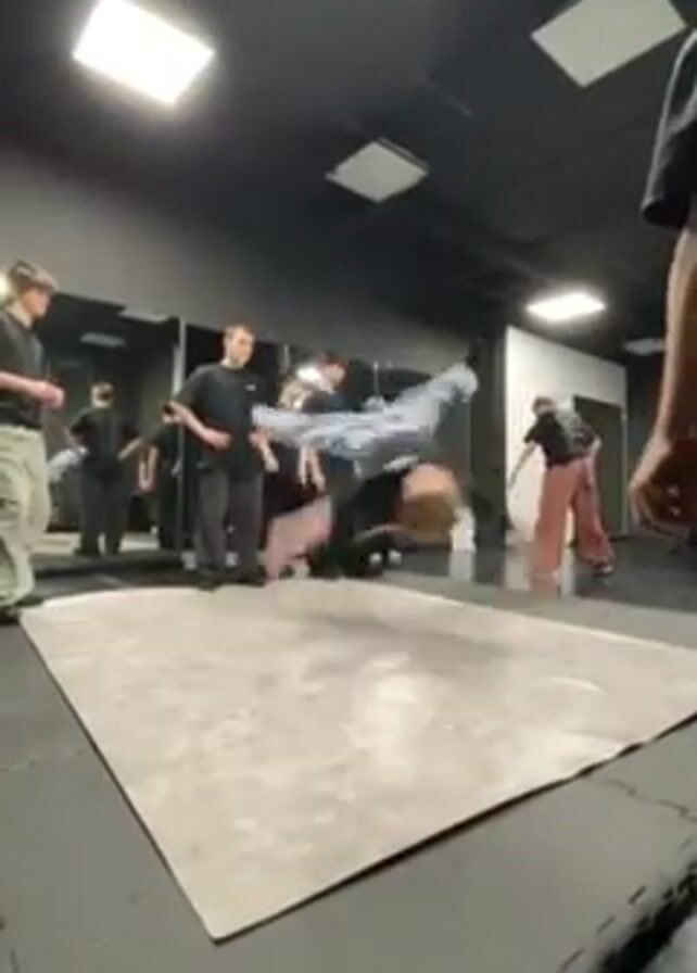 A person breakdances on a tan-colored rug, falling to the floor while upside down. They are wearing a black t-shirt and gray pants. Several other people are in the background, watching. Most of them are wearing black t-shirts and casual pants. The room has a black ceiling with several square lights, a mirrored wall, and a green floor.