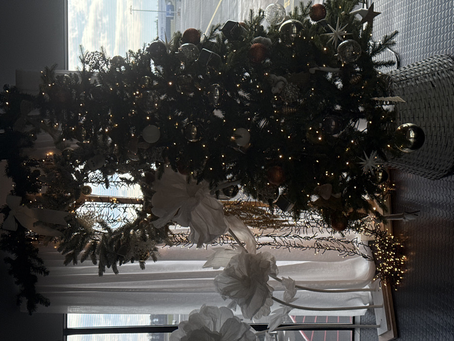 The scene depicts an indoor area at Luxembourg Airport (LUX) in Niederanven, Luxembourg, adorned with holiday decorations. A large, dark green artificial Christmas tree stands prominently in the right and central foreground, decorated with numerous warm white LED lights and various spherical ornaments in metallic tones (silver, gold, bronze), alongside star-shaped and textured baubles. The tree is situated in a light-colored, woven basket-style tree skirt. To the left, several large, multi-petaled white fabric flowers are arranged on vertical stands. Above and behind these elements, evergreen garlands with string lights and white ribbons are draped, with one wreath-like structure visible. White, sheer curtains are partially visible on the left, revealing a large window. Through this window, an airport tarmac is visible under a cloudy sky, with yellow ground markings and a distant, partially obscured commercial aircraft. Additional strands of warm white LED lights are scattered on the dark, textured floor beneath the decorations. No people are present.