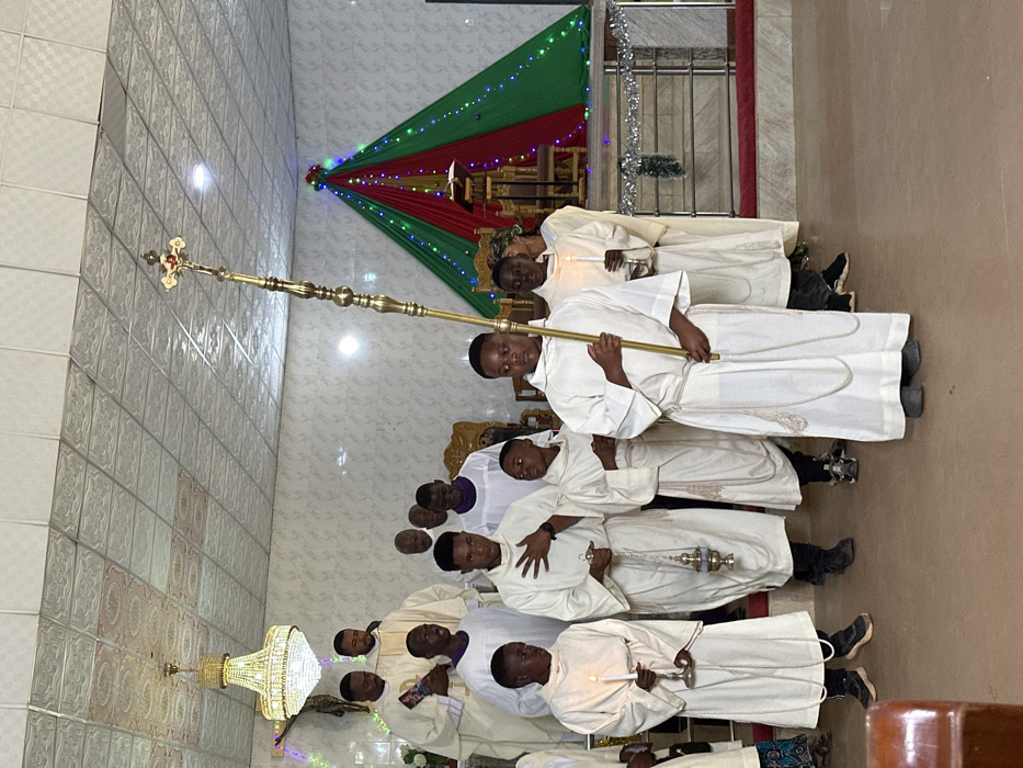 The image depicts the interior of a religious building, likely a church, located in Barakin Lerawi, Nigeria. Approximately fourteen individuals, predominantly male, are visible, engaged in a religious procession or service. In the foreground, four young males are positioned. The individual on the far right holds a tall, golden processional staff topped with a crucifix featuring a red and white corpus. To his immediate left, another young male holds a lit white candle within a silver candleholder. Adjacent to him, a third young male holds a golden censer (thurible) by its chains, with his right hand placed over his chest. A fourth young male on the far left also holds a lit white candle in a silver holder. All four wear ankle-length white albs over dark trousers and dark shoes, with one individual's patterned trousers partially visible on the far left. Behind the front row, several adult males are visible. Some wear white albs, while others wear white albs with purple stoles or cassocks visible underneath, indicating clergy or religious assistants. Two individuals are positioned on an elevated platform on the far left background, one holding a small book. More individuals are partially visible in the right background. The environment features light-colored, possibly tiled, walls with a subtle pattern and a white acoustic tile ceiling. A large, multi-tiered gold-colored chandelier hangs from the ceiling on the left. The background right displays a sanctuary area with a raised platform, demarcated by a silver railing. This area is decorated with red and green draped fabric, adorned with multi-colored string lights and silver tinsel garlands. A wooden lectern with an open book and a wooden chair are visible behind the drapes. The floor is a light brown, unpatterned surface.