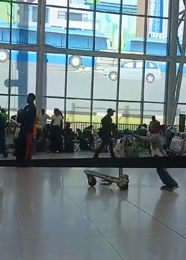 waiting area in what appears to be an airport. Several people are standing or sitting, many with luggage around them. A child is playing with an empty luggage cart, pushing it along the tiled floor. The area has large windows with a cartoon-like cityscape mural on them. Other people are moving around the space, some with heavily loaded luggage carts.