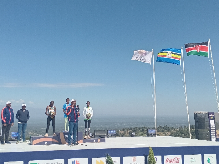 On a stage, six individuals are present, including three runners on a podium numbered 1, 2, and 3. One individual is speaking into a microphone. Behind them, three flags are waving on poles: one white, one blue and yellow, and one of Kenya. The backdrop features a mountainous landscape under a clear blue sky. Logos of sponsors line the front of the stage including Coca-Cola.