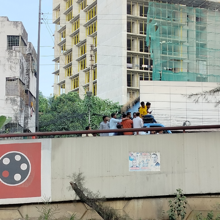 This image depicts an urban scene in Dhaka, Bangladesh. In the foreground, a concrete elevated structure, likely a bridge or overpass, extends horizontally across the frame. Its lower section reveals a dark body of water or canal with sparse vegetation and a fallen tree trunk. The concrete wall of the elevated structure features a large red and white circular emblem with five white dots and one red dot on its left side. To the right, a political poster displaying two male portraits and Bengali text is affixed. A brown metal railing runs along the top edge of this concrete barrier. On the elevated roadway, a group of approximately 10-12 adult males is gathered around and on a light blue sedan vehicle. Individuals are standing on the road surface adjacent to the car, with several others positioned on the vehicle's roof and hood. They wear casual shirts in various colors including white, orange, grey, and yellow; two men in yellow shirts are distinctly visible on the car's roof. Behind this gathering, dense green foliage partially obscures the midground, interspersed with a street light pole and numerous overhead electrical wires. The background features multiple buildings. To the far left, an older, multi-story concrete building with barred windows and visible laundry lines is present. Dominating the center-right is a large, multi-story building under active construction, characterized by its unfinished concrete frame with numerous yellow-framed window openings. The upper right portion of this structure is enveloped in green safety netting. A smaller, white, horizontally-paneled building is partially visible beneath the construction site.