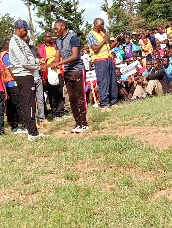 The image captures an outdoor gathering in Ngenyilel ward, Kenya, featuring a central interaction between three men, observed by a larger crowd. In the mid-ground, a man in a grey tracksuit and blue baseball cap is shaking hands with or exchanging an object with a second man, who wears a patterned blue polo shirt and dark track pants. The second man holds a small white bag or object in his left hand. To their right, a third man, dressed in a yellow high-visibility vest over a patterned blue shirt and dark blue track pants, is speaking into a black microphone. Behind these central figures, an assembly of approximately 50-70 individuals, primarily adult males, are seated or standing on sparse grass and exposed earth. Several members of the crowd wear various colored shirts. A red sign is visible, displaying "TEAM MANAGERS," and beneath it, a white sign partially reads "EPKATE..." and "CHEBAIIWA." The background features a line of tall green trees under a bright, slightly overcast sky. The foreground consists of uneven ground with patches of green grass interspersed with bare soil.