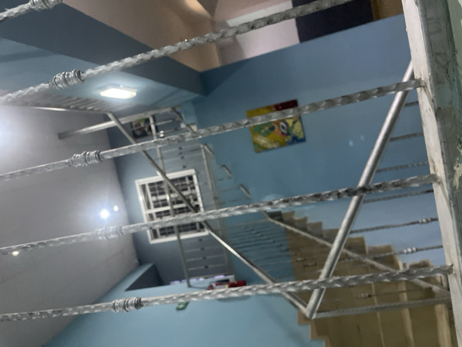 A low-angle shot through a metal railing reveals a blue-walled interior. Stairs ascend to the right, and a square window sits to the left. A colorful abstract painting hangs on the wall. The ceiling above is partially visible with recessed lighting. The overall perspective is slightly tilted.