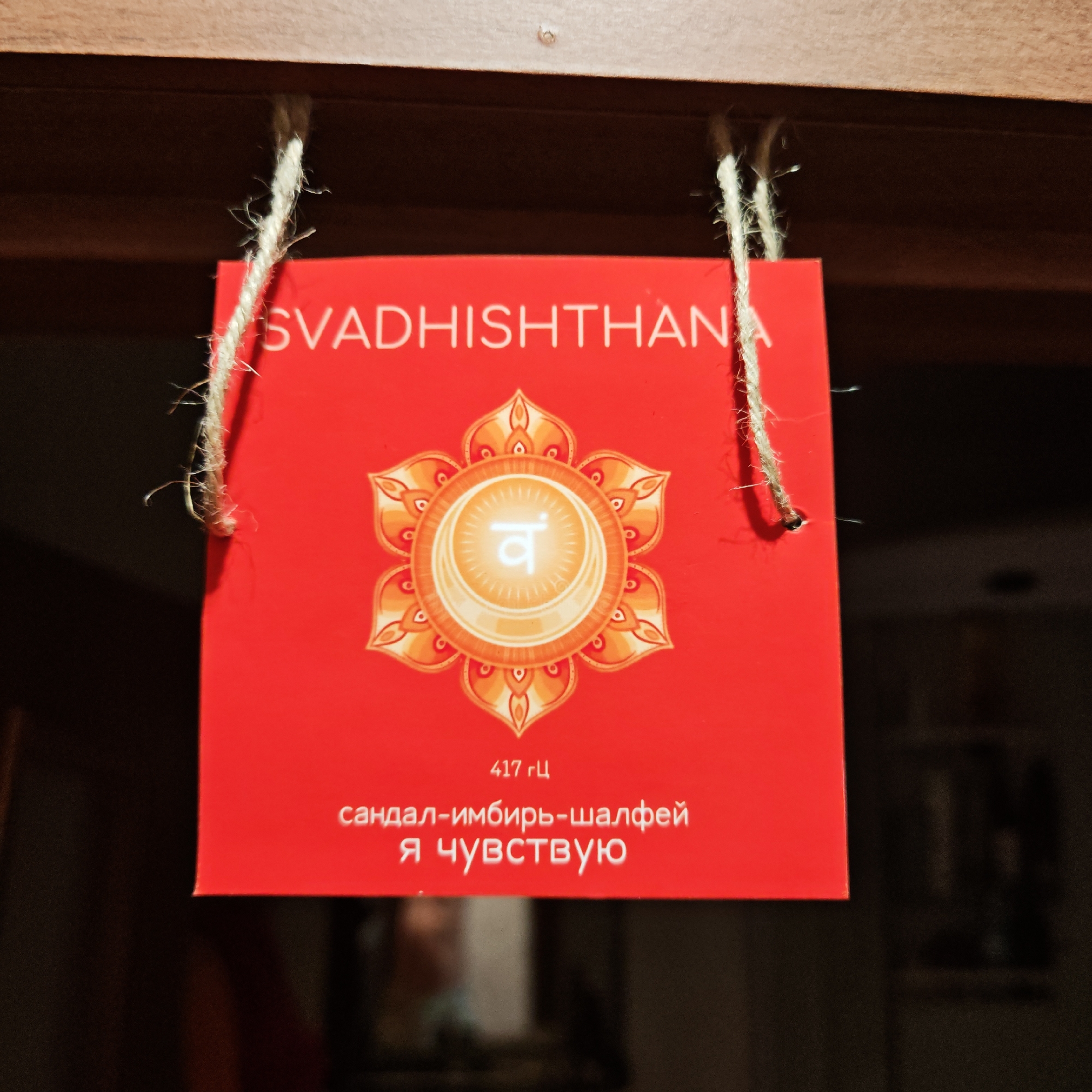 A square red sign with white text and an orange lotus flower design hangs from a wooden surface by two pieces of twine. The text on the sign reads "SVADHISTHAN" at the top, followed by the lotus design with a symbol in the center. Below the design, it reads "417 ГЦ" (Hz). Further down, the sign has the words "сандал-имбирь-шалфей" (sandal-ginger-sage) and "Я ЧУВСТВУЮ" (I feel) in white text. The background is a dark blurred image of a room, suggesting an indoor setting. There is no indication of the location being Rostov, Russia.