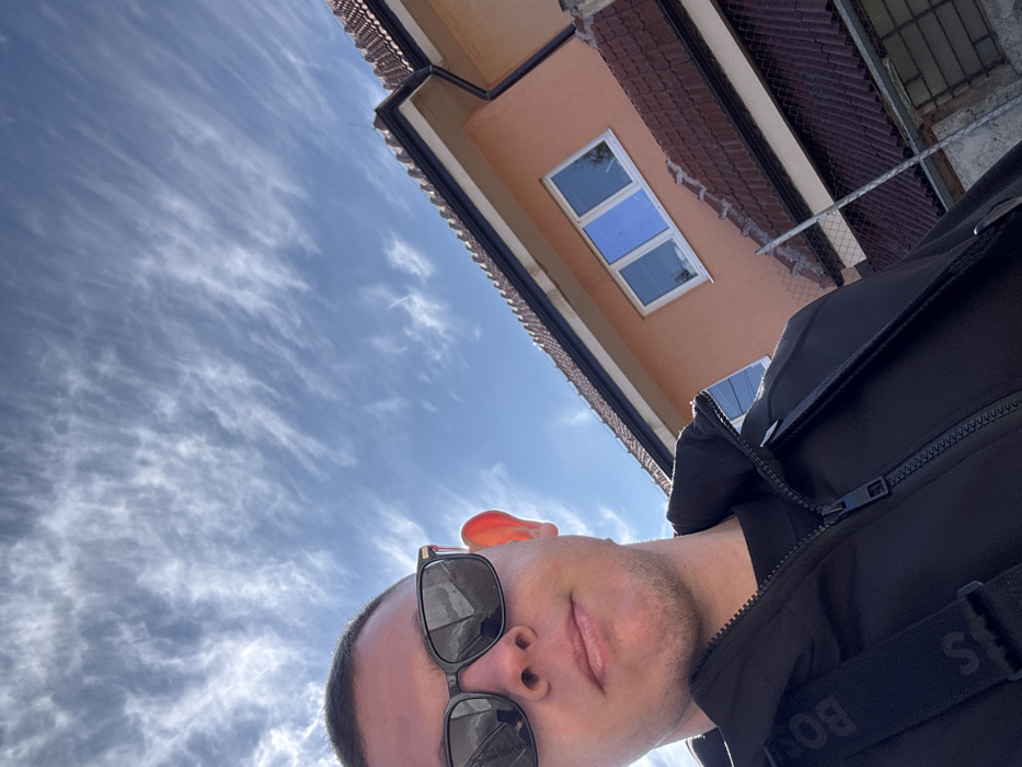 The image displays a selfie-style portrait of a male individual captured outdoors in the city of Podgumer, Bulgaria