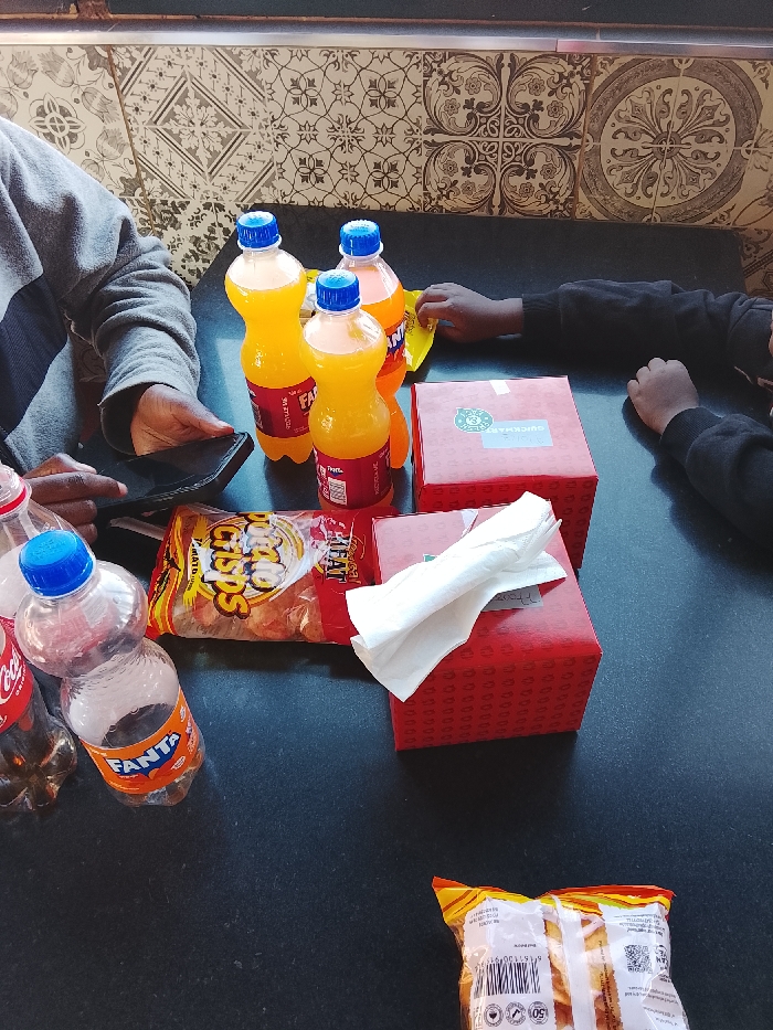 A black table is laden with food and drinks: Fanta and Coca-Cola bottles, three bottles of orange juice, a bag of potato crisps, two red takeaway boxes with napkins, and a bag of rolls. Two people are visible, one holding a phone and another with hands on the table. The background features patterned tiles.