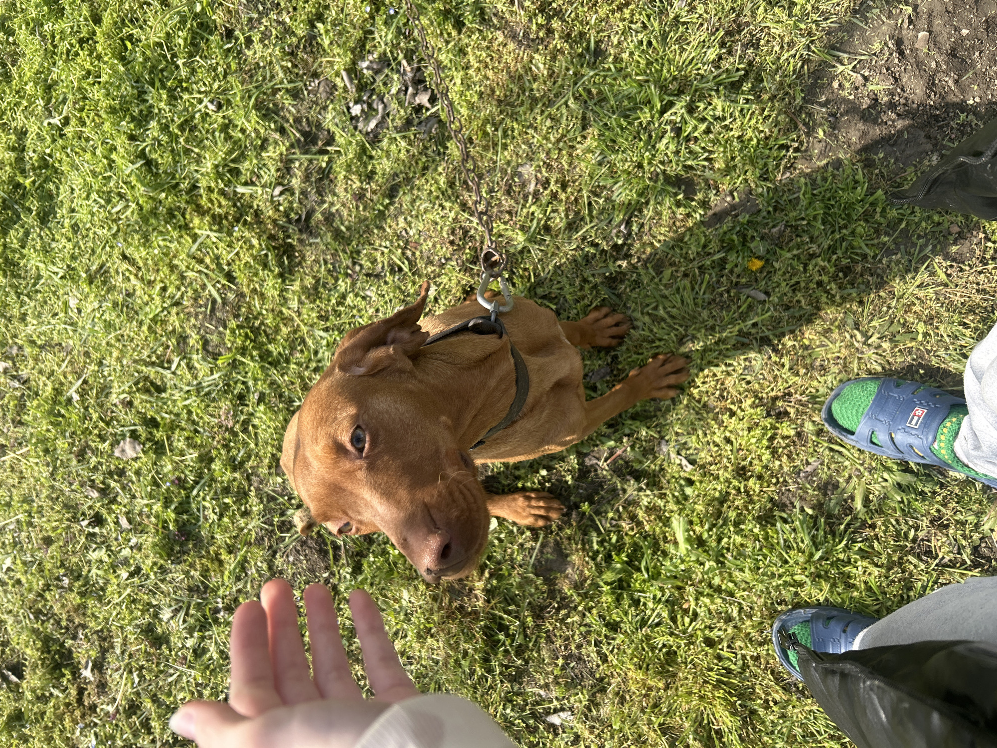 A medium-sized brown dog is lying on green grass. The dog has a collar and chain leash. A person is standing near the dog, reaching out a hand toward it. Another person is standing nearby, wearing blue and green sandals and light-colored pants. The location is Gorsko Ablanovo, Bulgaria. The scene appears to be outdoors.