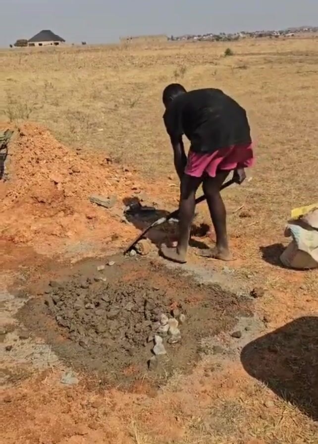 two men working on a construction project in a dry, open field with sparse vegetation. One man, wearing a black shirt and pink shorts, is mixing cement with a shovel. Another man, wearing a white shirt and jeans, is standing near a partially constructed square structure made of concrete blocks. A blue lid is placed on top of the structure. A pile of dirt is visible in the background. There are also several cinder blocks lying on the ground around the structure. In the distance, there are a few buildings. The sky is clear and the weather appears to be sunny.