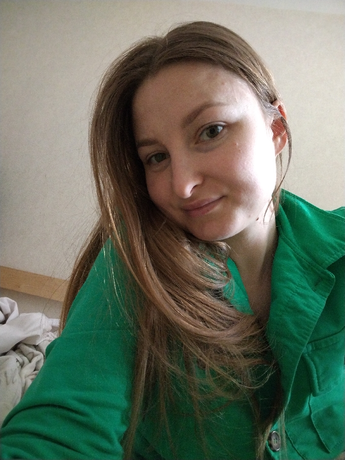 The image captures an indoor, close-up scene of a single individual. The subject is a female with long, light brown hair parted near the center, flowing over her shoulders and chest. She has a fair complexion, light-colored eyes, and a slight smile, with her head tilted slightly to the viewer's right. She is wearing a long-sleeved, collared green garment, possibly a shirt or light jacket, with a visible brown button located on the right side of the frame. Her gaze is directed towards the camera. The background consists primarily of a plain, light-colored (off-white or beige) wall. In the lower-left corner, a horizontal light-colored wooden structure, resembling a bed frame or headboard, is partially visible, with a pile of light-colored fabric, likely bedding or clothing, resting nearby. No discernible features within the image identify the location as the city of Chaikovsky, Russia.