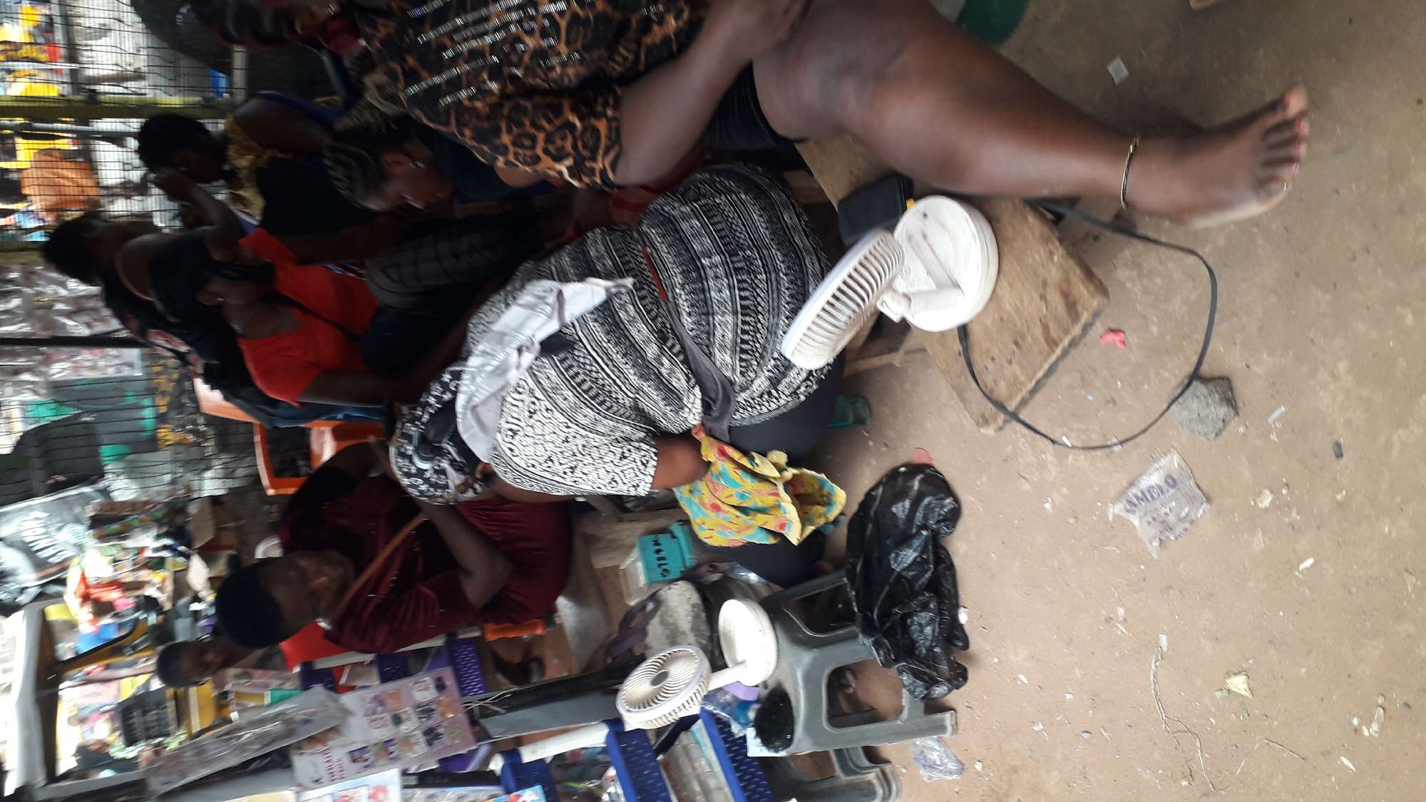 The image depicts a scene in what appears to be a market in Onitsha, Nigeria. Several people are sitting closely together on chairs. One individual is wearing a leopard print top, while another has on a black and white patterned garment. A woman has bare feet, one with an anklet. There are two small white electric fans in the scene. The floor is bare concrete. Various objects are scattered around including plastic bags, a piece of wood, and miscellaneous merchandise. The environment suggests a crowded marketplace setting, with stalls or stands visible in the background.