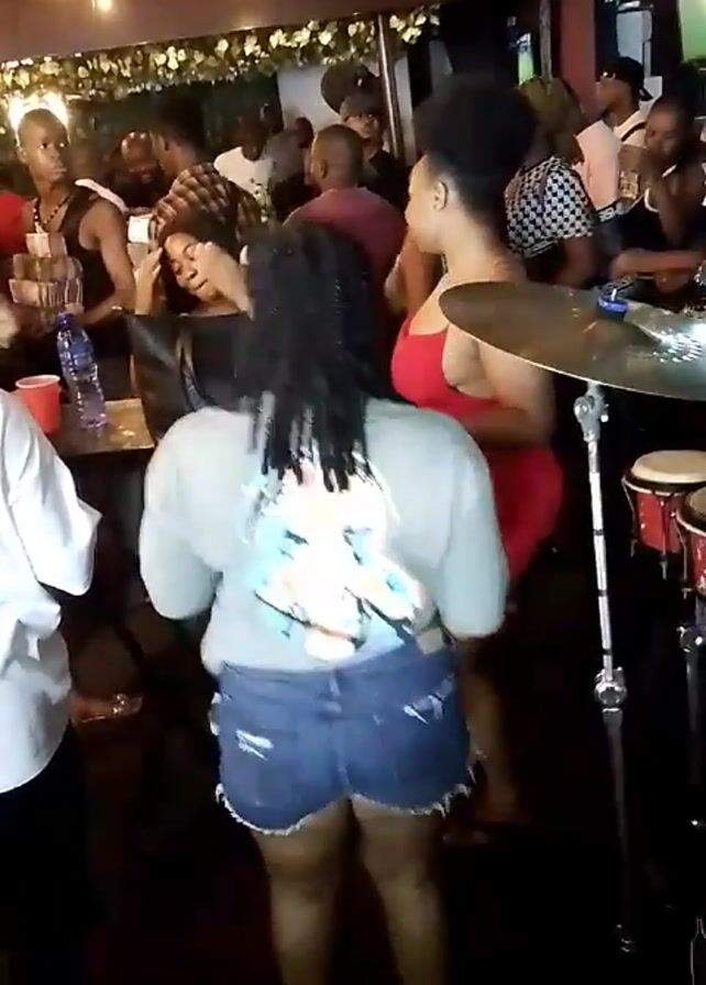crowded indoor venue, likely a club or bar, with people dancing and socializing. The lighting is dim with decorative string lights adding ambiance. In the foreground, a woman with dreadlocks and wearing denim shorts and a light-colored shirt dances with her back to the camera. To her left, a person in a white shirt stands near a table with drinks. To her right, there's a drum set and a woman in a red dress. The crowd consists of diverse individuals, some seated at tables and others standing or dancing. The atmosphere appears lively and festive.