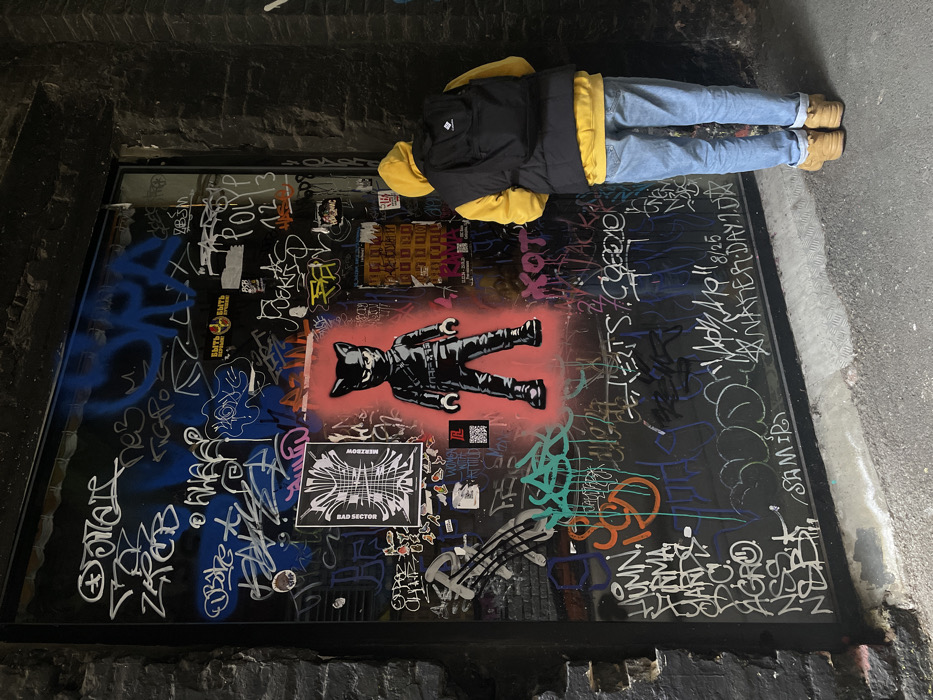 The image depicts an outdoor urban scene in Belgrade, Serbia, centered on a large, dark rectangular surface, likely a boarded-up window or panel, extensively covered in graffiti, stickers, and posters. The surface is framed by dark, weathered brick walls on either side. In the center of the dark panel, a prominent black stencil or sticker portrays a stylized figure resembling a Playmobil character with a black, masked head featuring distinct cat-like ears. This figure is outlined by a glowing red aura. To its left, a black and white poster with "BAD SECTOR" and "MERZOW" text displays an abstract, warped grid pattern. The entire panel is densely covered with various graffiti tags in white, blue, green, orange, and black spray paint, some in Cyrillic script and some in Latin script, including discernible words such as "KOT," "SAMIR," "FIRMA GARD," "AGRO," and "POLYP." Additional, smaller stickers and faded posters are scattered across the surface. To the right of the central artwork, a single individual stands facing the graffiti-covered panel, viewed from behind. The person wears a bright yellow hooded sweatshirt with the hood up, a black puffer vest, light blue jeans, and tan work boots. A black backpack, possibly with a faint "Columbia" brand logo, is worn over the vest. The person's stance suggests observation or interaction with the displayed artwork or graffiti. The ground beneath the individual is asphalt or concrete, with a light-colored, possibly metal or tactile, strip running along the base of the wall.