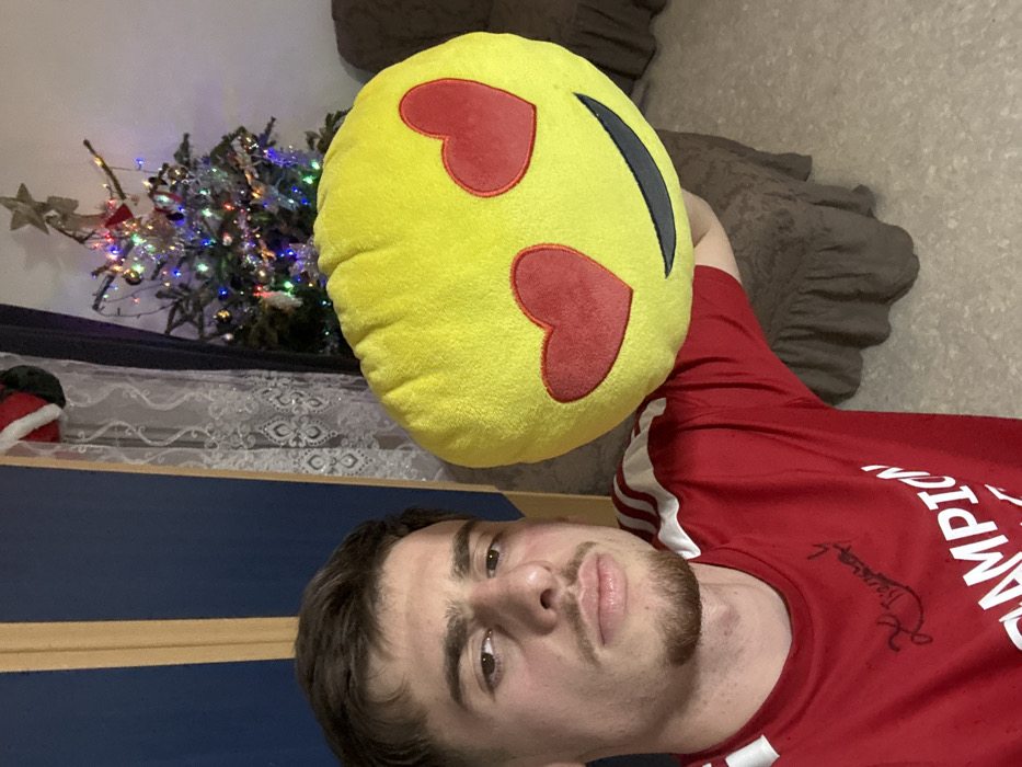 A man in a red sports shirt poses with a yellow emoji pillow with red heart eyes. A Christmas tree with colorful lights stands on a blue and white surface behind the pillow. A brown textured sofa or bedding is in the background on the right side. The man has brown hair and a short beard, and the photo appears to be taken from a slightly elevated angle, possibly a selfie.