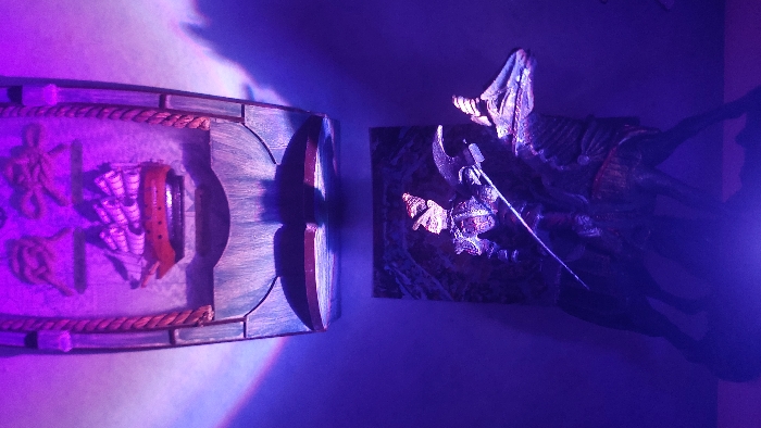 The image displays two decorative wall-mounted objects illuminated by predominantly purple and blue light, located indoors in Slivnitsa, Bulgaria